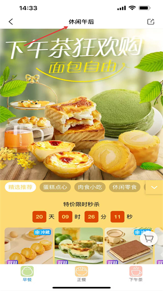 3、休閑午后板塊,主打下午茶狂歡購,有面包、蛋撻等美食,設多分類及特價限時秒殺,打造面包自由消費場景。