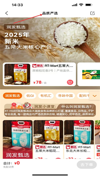 4、品質嚴選板塊,推2025新米五常大米,原糧稻花香2號產地直供78元袋,潤發甄選覆蓋全品類,嚴選供應鏈保品質。