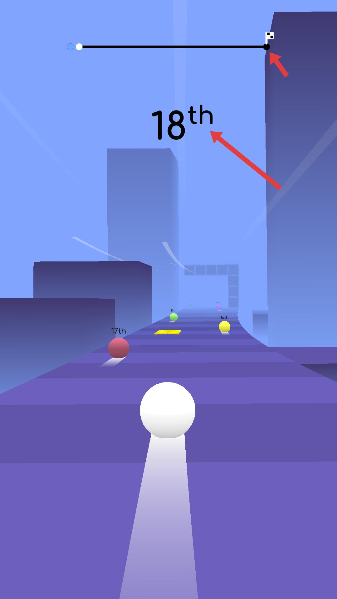 2、比賽過程中,關注上方進度條和排名顯示,當前排名18th,努力讓小球加速,超越前方小球,提升排名。