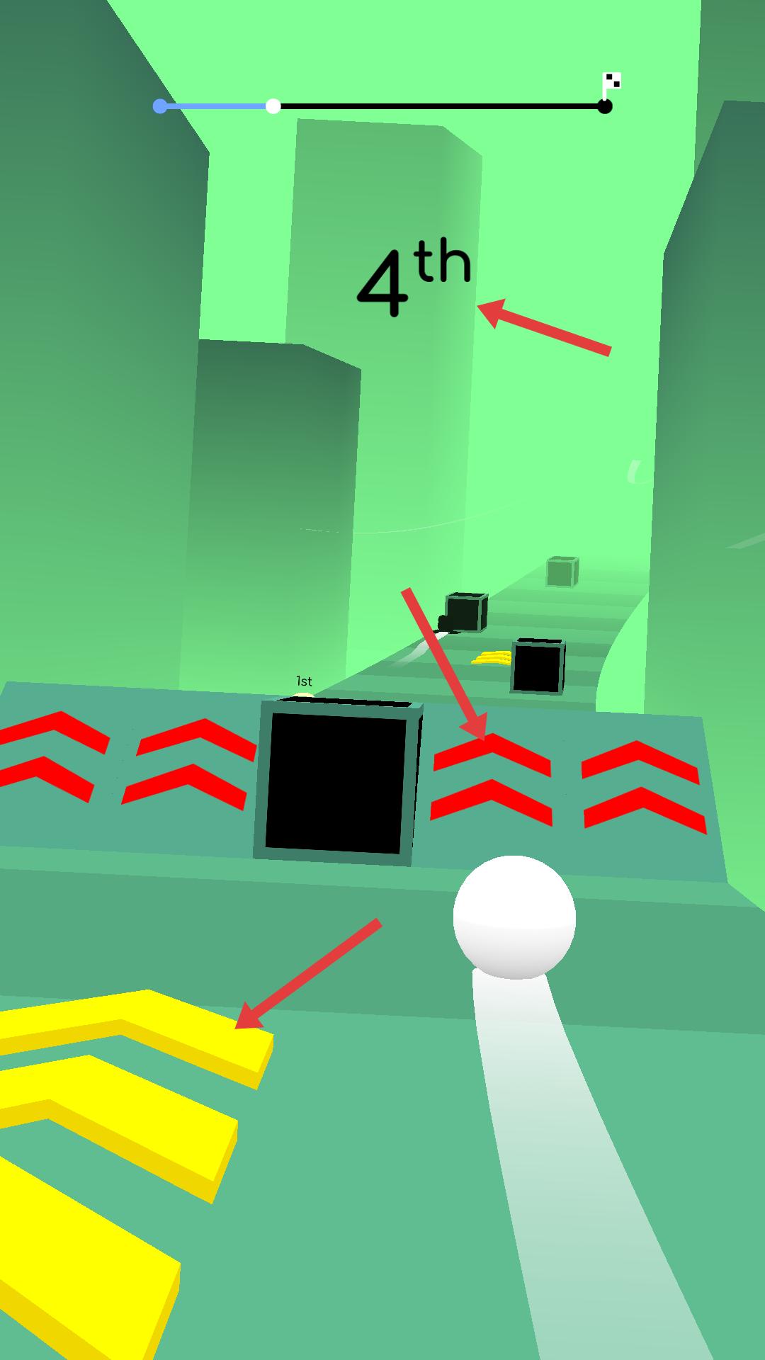 3、賽道出現黑色方塊和箭頭等元素,箭頭可助力加速,要避開黑色方塊,同時借助箭頭優勢,提升到更靠前的排名。