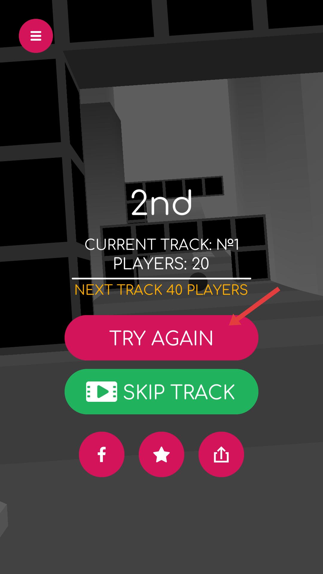 4、若比賽結束,獲得2nd名次,若想再次挑戰,點擊箭頭所指按鈕,重新開始賽道1的比賽,爭取更好成績。