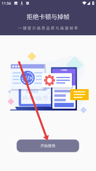 1、一鍵提示畫質品質與畫面幀率說明操作便捷,界面以科技感插畫展示優化原理,開始使用按鈕邀請用戶開啟流暢體驗。