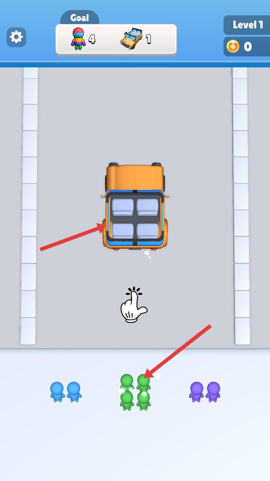 1、游戲界面有車輛和不同顏色小人,需將對應顏色小人引導至車輛處,讓他們進入車輛,推進關卡進程。