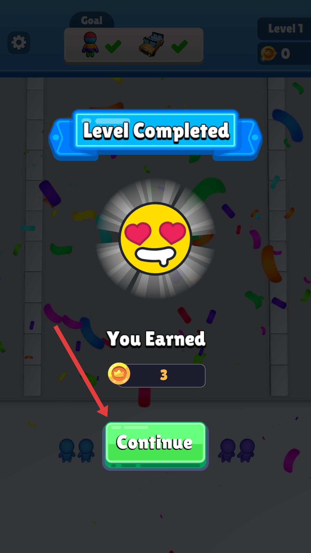 2、成功完成關卡后,會顯示Level Completed,并獲得金幣獎勵,點擊Continue按鈕,可進入下一個關卡,繼續游戲挑戰。