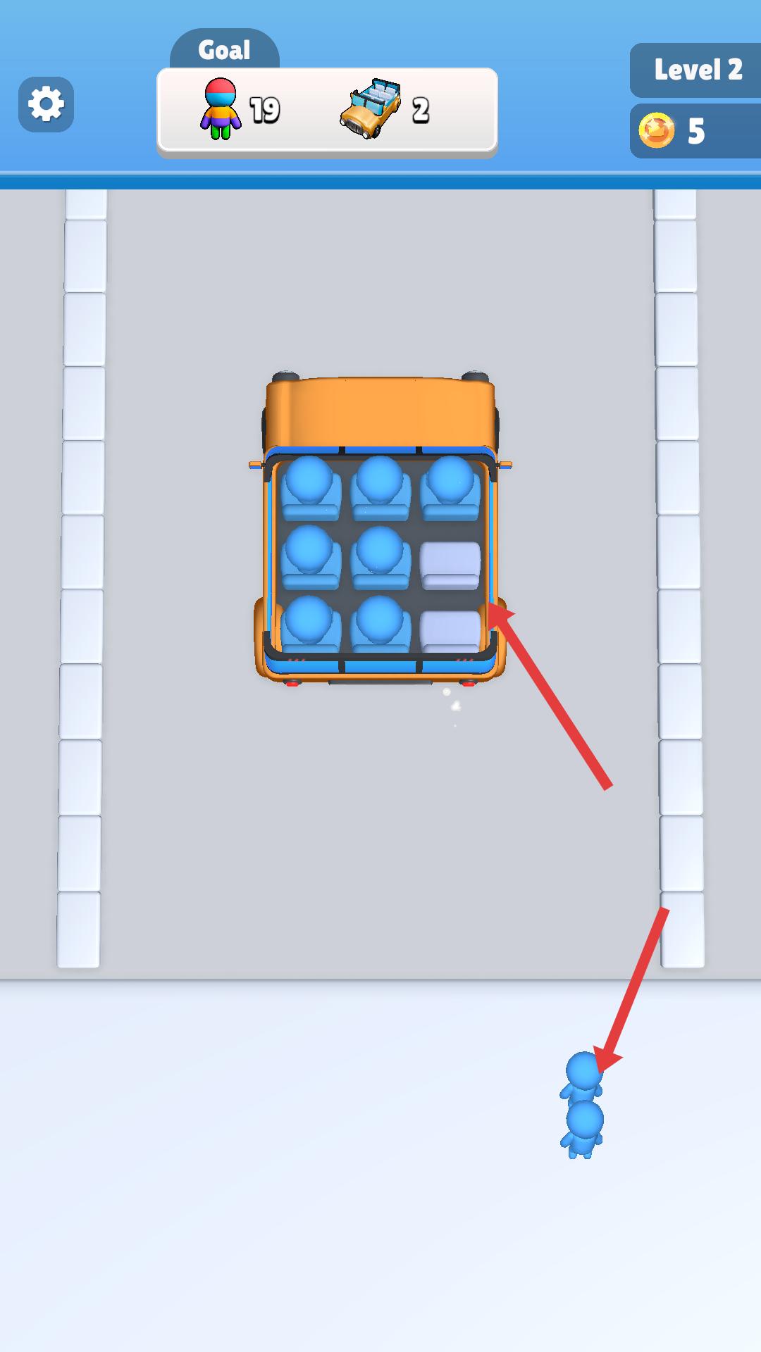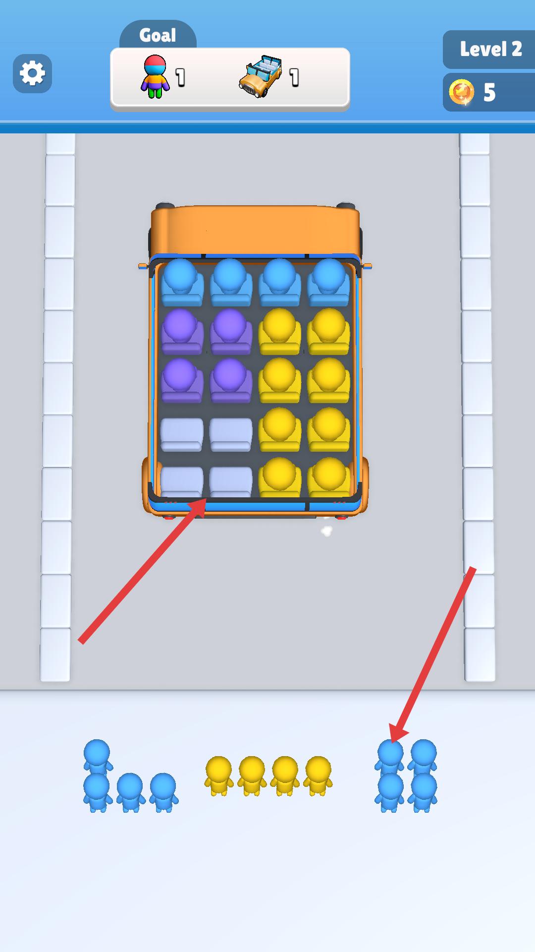 3、進入新關卡后,車輛座位數增加,需搭載更多小人,將對應顏色小人引導到車輛旁,讓他們依次進入車輛,填充座位。