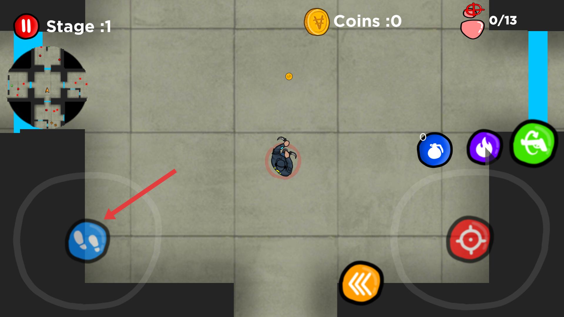 2、進入關卡1,左側有藍色腳印按鈕,操控它可控制角色移動,在場景中探索,收集金幣,同時留意敵人位置。