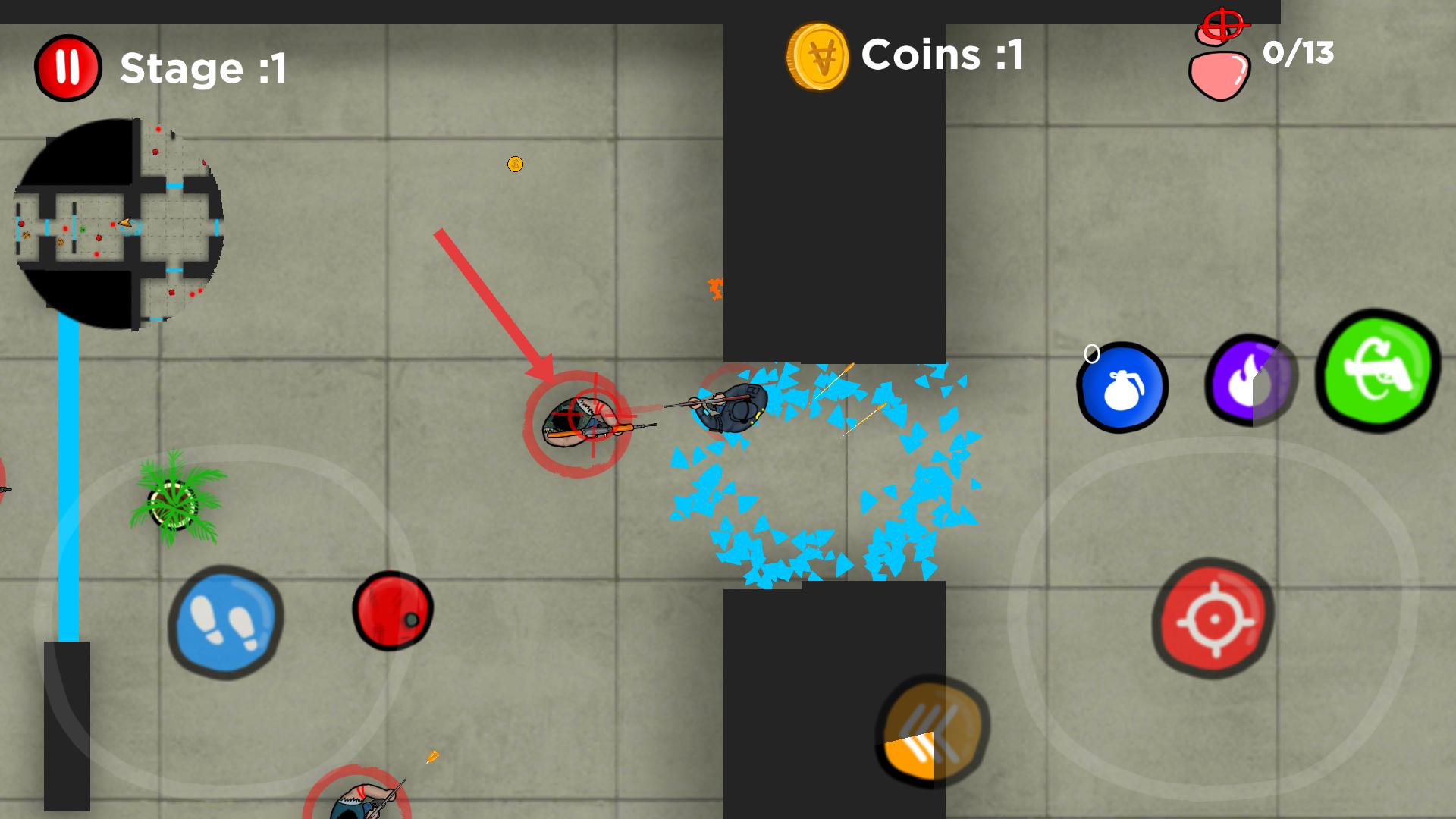 3、遇到敵人時,利用右側攻擊相關按鈕,瞄準敵人進行攻擊,消滅敵人可獲得金幣,注意躲避敵人的反擊。