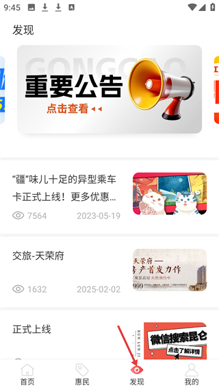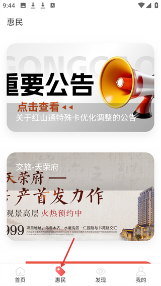 2、惠民界面展示重要公告和房產推廣信息,方便用戶了解紅山通特殊卡優化調整等公告內容。