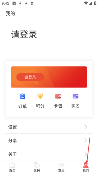 4、我的界面可登錄后查看訂單、積分、卡包等,還有設置、分享等選項,方便用戶管理個人紅山通卡相關事務。