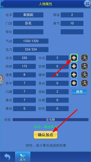 2、在人物屬性界面加點,如增加攻擊屬性,點擊確認加點提升角色戰力,增強角色在戰斗過程的表現。