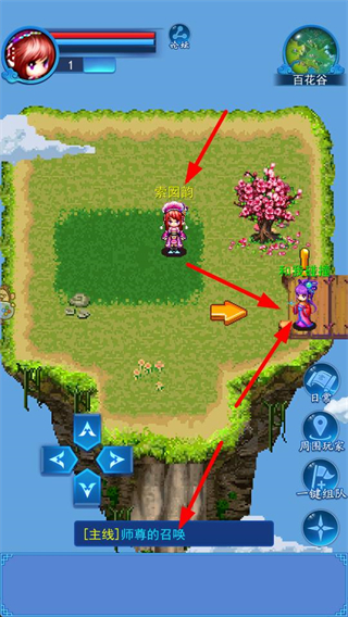 1、在百花谷里移動角色,接取主線任務如師尊的召喚,與NPC對話推進劇情,開啟仙俠冒險之旅。