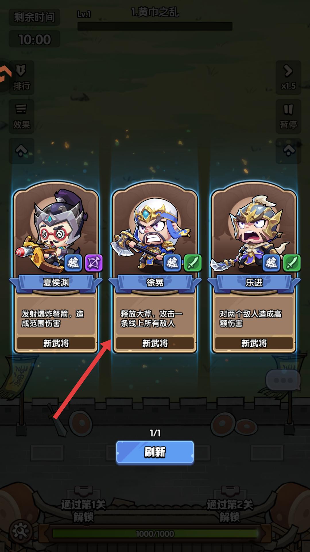2、進入戰斗后,可選擇武將,像夏侯淵能發射爆炸弩箭造成范圍傷害,徐晃可釋放大斧攻擊一條線上所有敵人,合理選擇助力戰斗。