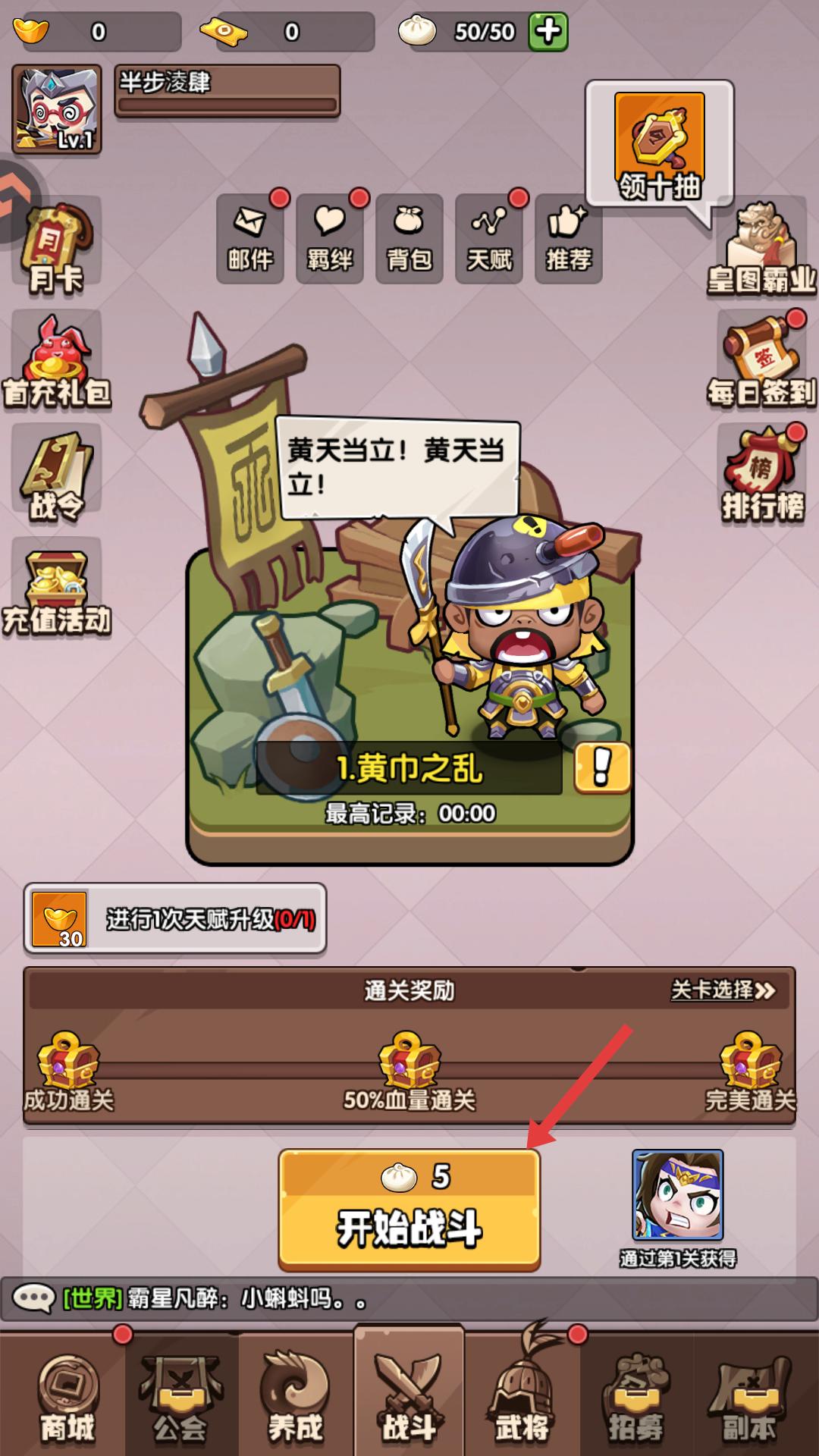 1、點擊【開始戰斗】,消耗5個包子,即可進入關卡,開啟戰斗,挑戰黃巾軍,推進游戲進程。