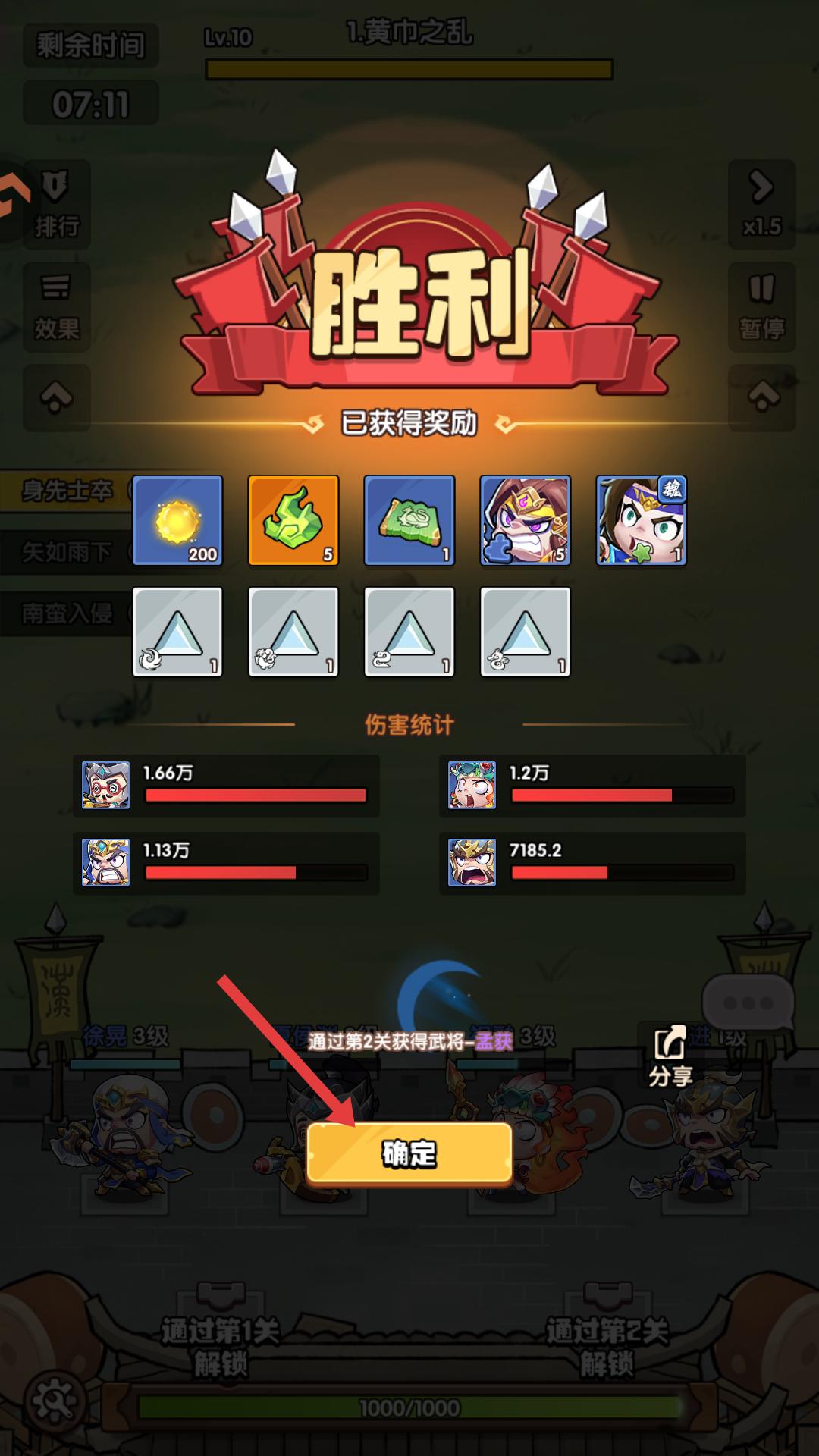 4、成功戰勝敵人后,會顯示勝利界面,獲得金幣、道具等獎勵,點擊【確定】,就能領取獎勵,結束該關卡并為后續挑戰做準備。