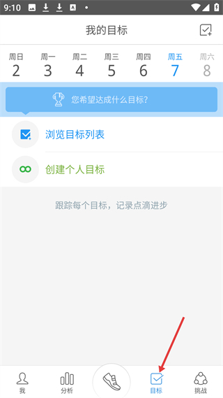 4、目標模塊可瀏覽目標列表或創建個人目標,按周規劃運動目標,跟蹤進度,有效激勵用戶達成運動計劃。
