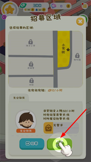 3、在招募區域選擇小芳街等區域,點擊招募按鈕,尋找無業游民等租客,擴充租房客源。