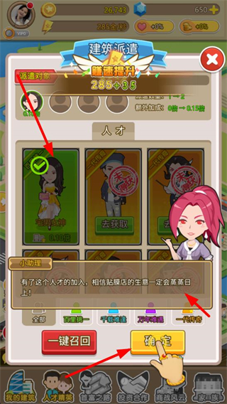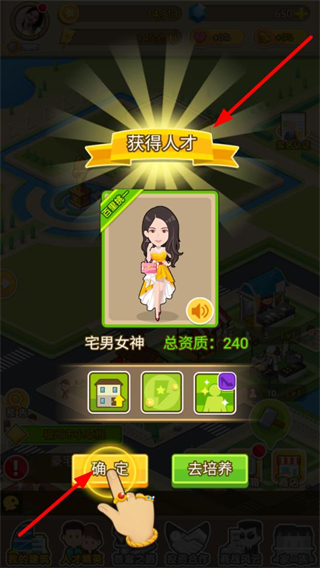 1、獲得人才后點擊確定,將人才納入團隊,為產業運營和財富積累提供人才支持,推進游戲進程。