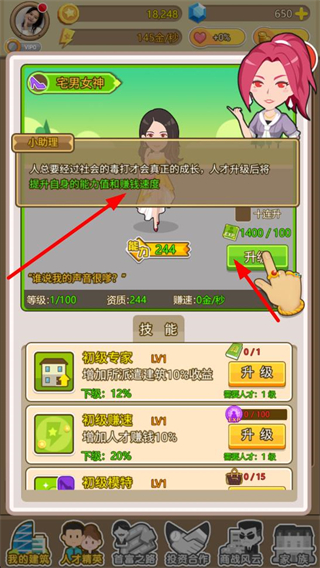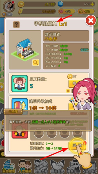 3、派遣人才到手機貼膜攤等產業,提升產業的賺錢速度,增加金幣獲取,加速財富積累和產業發展。