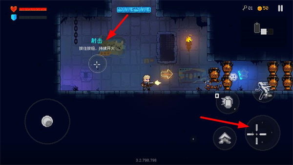 4、按住射擊按鈕可持續開火,打破罐子后可獲取金幣和道具,提升角色戰力。