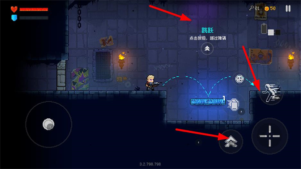 2、點擊跳躍按鈕可讓角色跳躍,越過障礙,還可使用沖刺功能,快速移動或躲避攻擊。