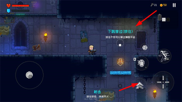3、按住跳躍按鈕可下跳穿過彈跳平臺,在場景里利用該操作到達不同區域,繼續探索。