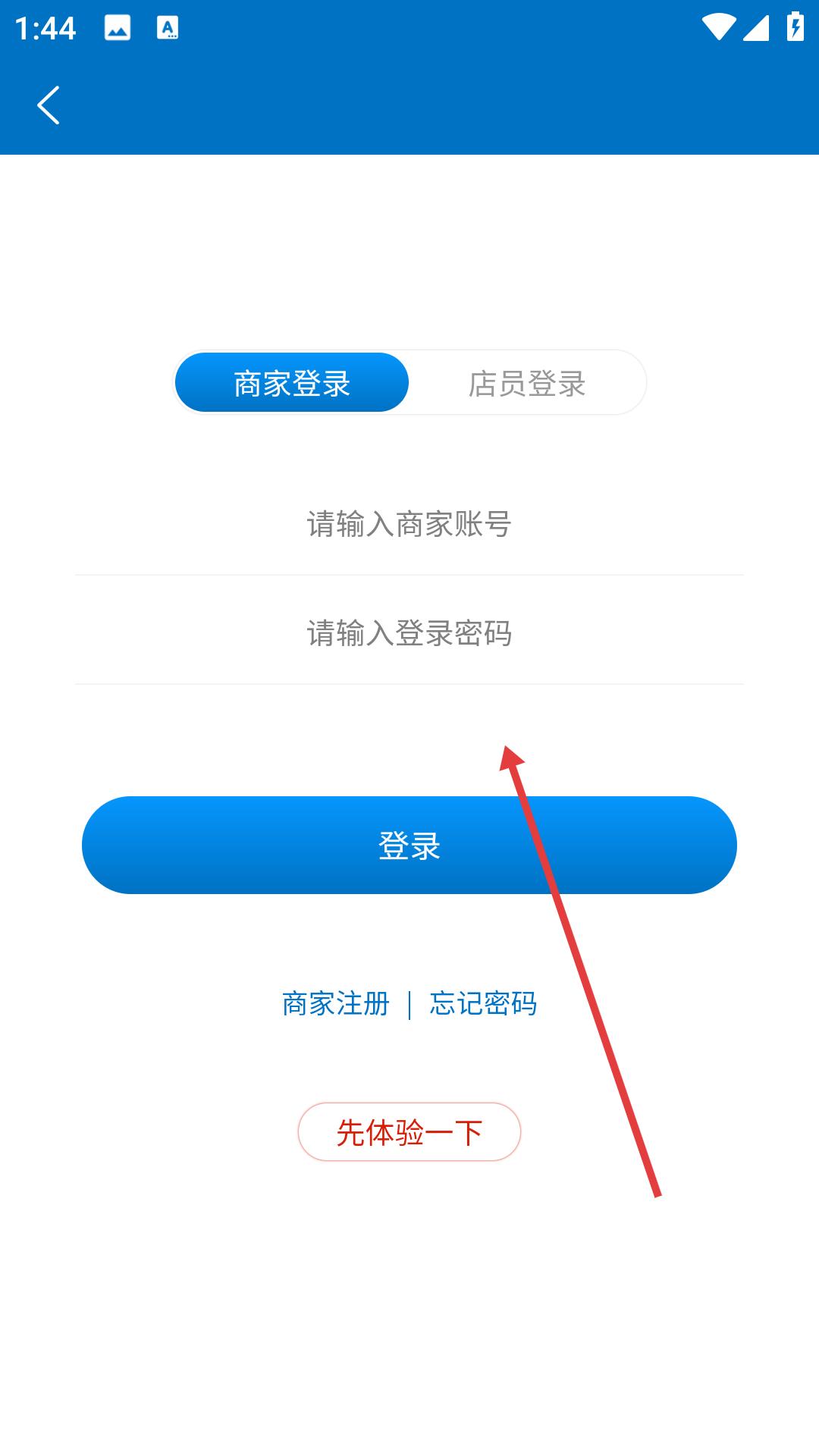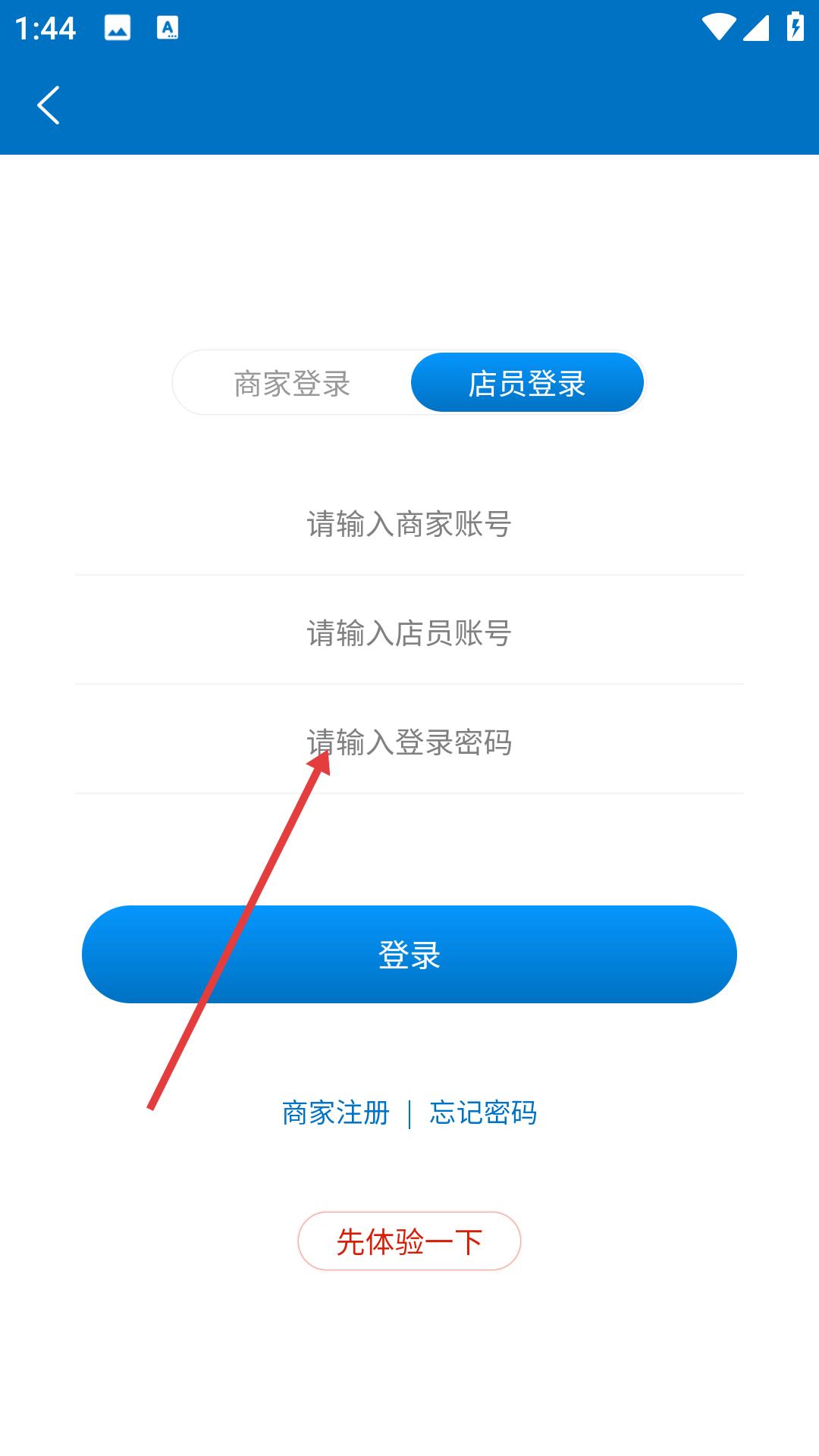 3、店員登錄需輸入商家賬號、店員賬號和登錄密碼,完成輸入后點擊登錄按鈕即可,同時也支持商家注冊、忘記密碼和先體驗一下的選項。