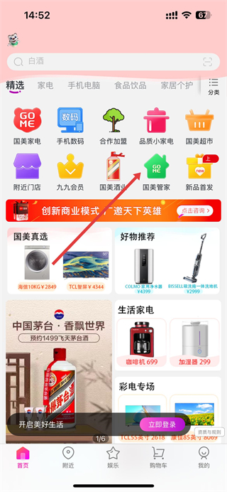 1、進入國美首頁,可看到國美管家等功能入口,點擊國美管家選項,進入生活服務頻道頁面,查看家居維修等各類生活服務項目。