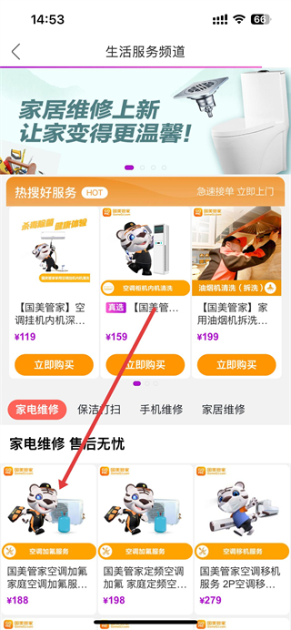 2、生活服務頻道頁面,能看到熱搜好服務家電維修等板塊,選擇家電維修里的空調加氟服務,點擊進入該服務的詳情頁面查看信息。
