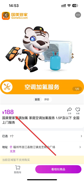 3、空調加氟服務詳情頁可查看服務價格適用范圍等信息,若當前區域無貨,可點擊看相似商品按鈕,查找同類型的可購買服務。