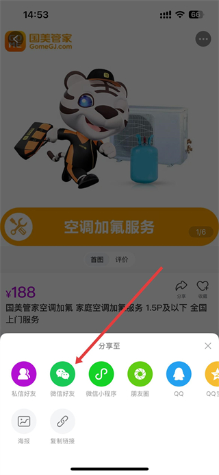 4、點擊服務詳情頁的分享按鈕,可選擇私信好友微信好友等渠道,將該空調加氟服務的信息分享給他人,也能生成海報或復制鏈接分享。