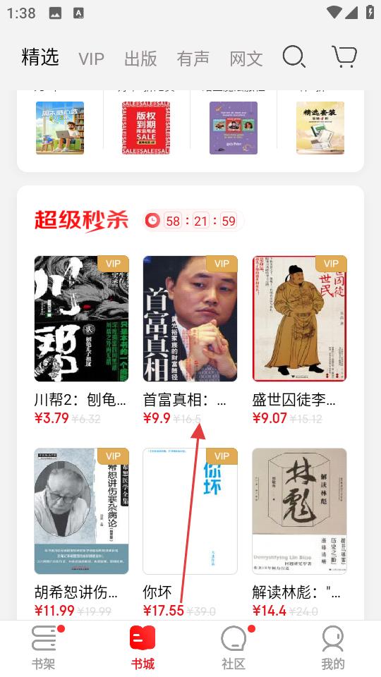 1、進入書城頁面,在超級秒殺區找到心儀書籍,點擊進入詳情頁,查看價格、簡介等信息。