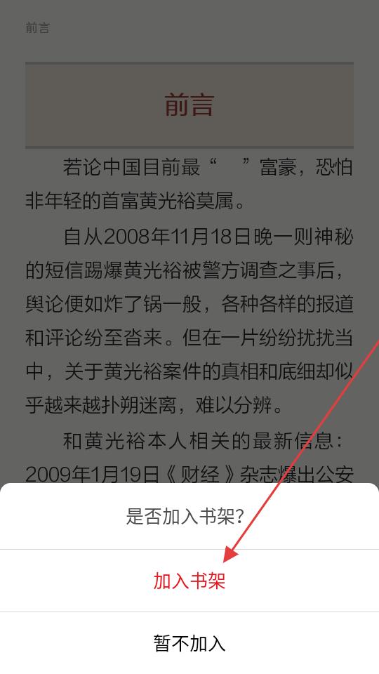 3、閱讀時彈出是否加入書架提示,選擇加入書架,將書籍保存至書架,方便后續隨時查找閱讀。