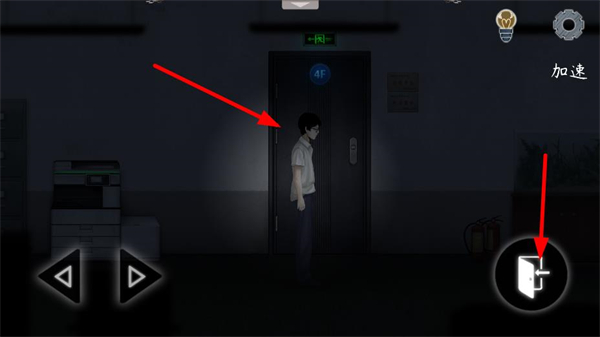 2、在4F樓層的走廊場景,可通過界面上的按鈕控制角色移動,還能點擊門形按鈕嘗試與電梯門等設施交互。