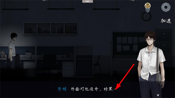 1、看到昏暗的辦公室場景,角色崇明會發出外面好黑的感慨,開啟這段帶有懸疑感的探索進程。