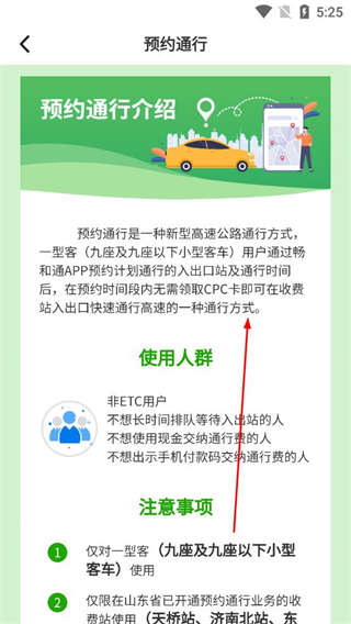 1、打開暢和通軟件進入首頁,找到預約通行選項并點擊,進入預約通行介紹頁面,查看該服務的定義使用人群及注意事項。