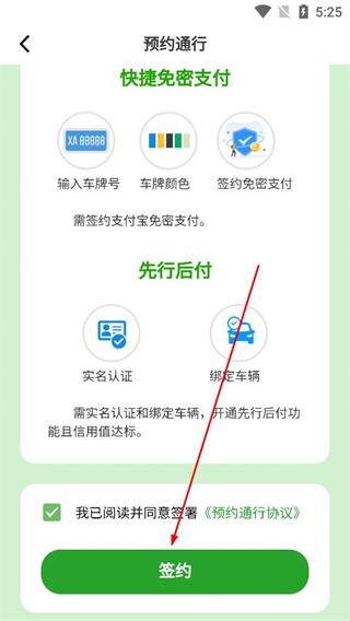 2、在預約通行頁面選擇快捷免密支付或先付后付方式,完成對應信息填寫,勾選同意預約通行協議后點擊簽約按鈕。
