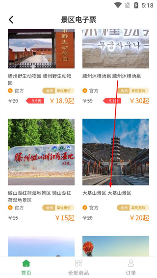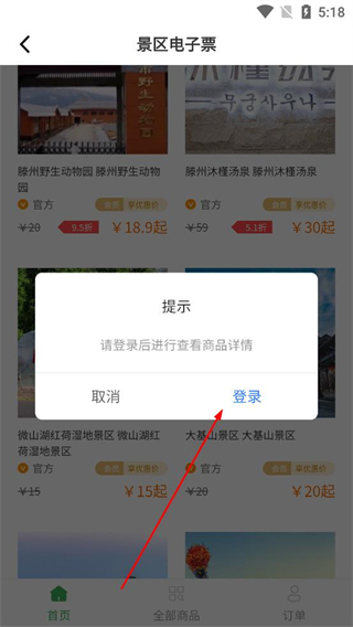 2、在景區電子票列表中選擇目標景區門票,點擊后彈出提示,需登錄后查看商品詳情,此時選擇登錄選項進入登錄界面。