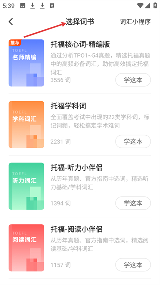 1、詞書選擇頁面有托福核心詞精編版等多本詞書,涵蓋真題高頻詞、學科詞等,助力托福詞匯學習。