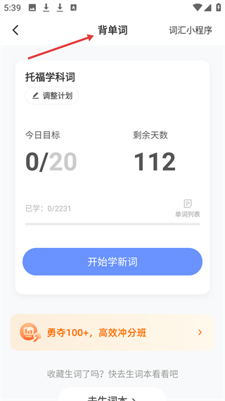 2、背單詞界面展示托福學科詞學習計劃,可調整計劃,顯示今日目標、剩余天數等,方便用戶開展單詞學習。