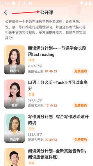 3、公開課頁面有閱讀、口語等多類免費課程,如閱讀滿分計劃,由魏丹云等老師授課,傳授聽說讀寫及考試技巧。
