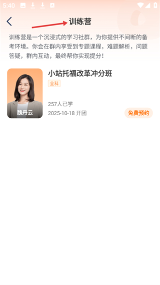 4、訓練營頁面介紹沉浸式學習社群,提供小站托福改革沖分班,含專題課、答疑等,助力托福備考提分。
