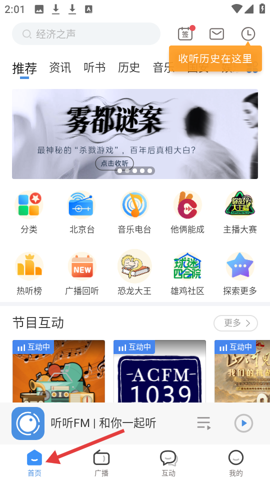 1、首頁上方有搜索欄,設推薦等板塊,中部展示節目海報,下方含分類、電臺等快捷入口收聽歷史提示醒目。