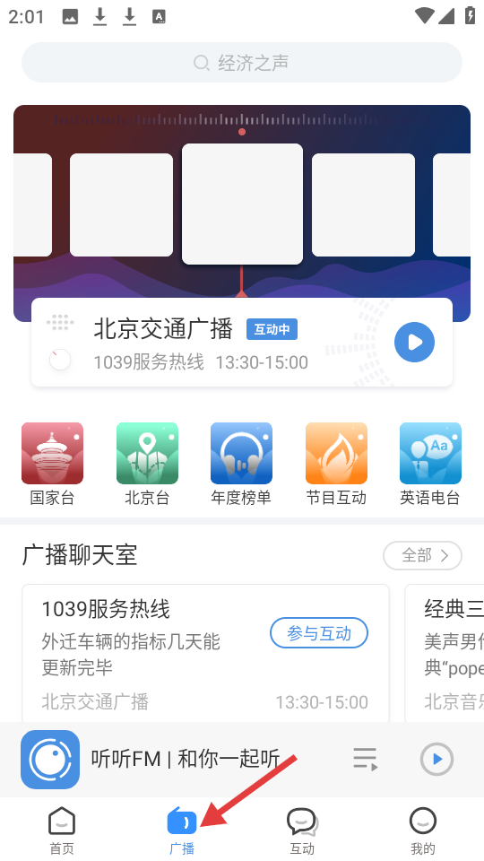 2、廣播頁面頂部搜索欄下是北京交通廣播信息,下方有國家臺、北京臺等分類,還有廣播聊天室及互動入口。