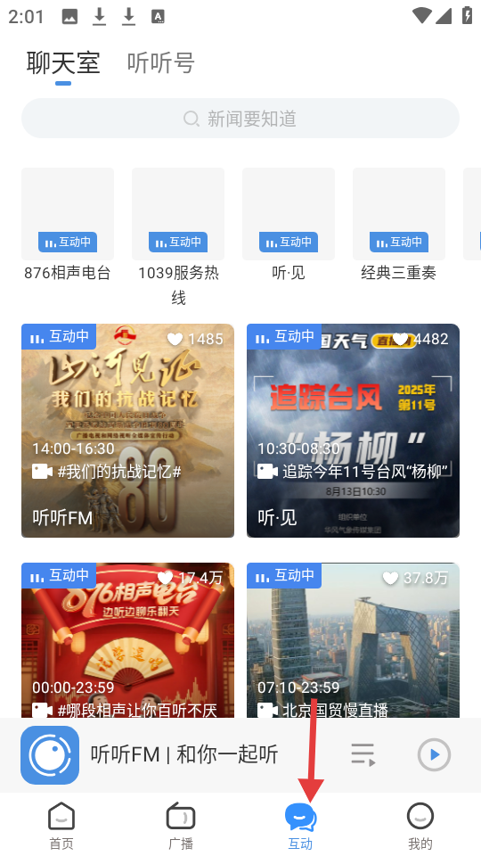3、互動頁面上方有聊天室等選項卡,下方展示多個互動節目,顯示互動狀態、時段及話題等信息。