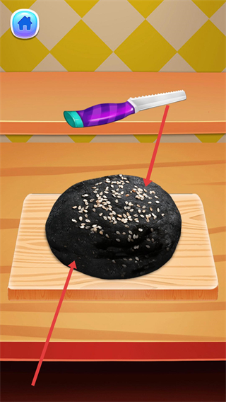 1、準備好黑色的漢堡胚,上面還撒有芝麻,旁邊有一把帶紫色手柄的刀,為后續制作漢堡做準備。