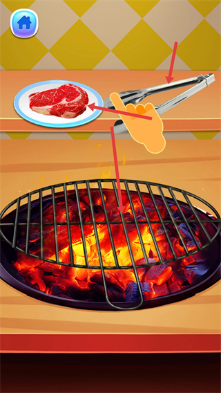 2、用夾子把生牛排放到燒得通紅的烤架上烤制,等牛排烤好,就可以用于制作漢堡。