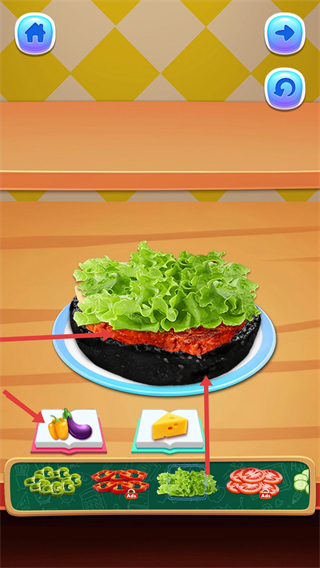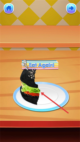 4、最后完成漢堡制作,會看到盤子里的漢堡被吃掉一部分,還出現再吃一次的提示。