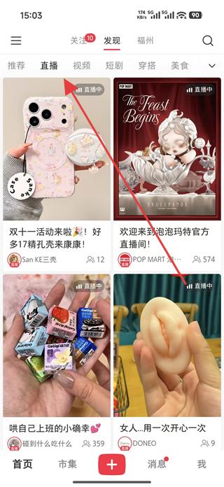 4、購買完成后進入發現頁面,點擊直播板塊,瀏覽雙十一活動、泡泡瑪特官方等直播間,觀看直播了解更多商品。