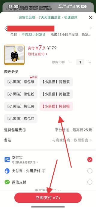 3、在訂單確認頁面選擇顏色分類,如小黑貓挎包橙等,確認購買數量,選擇支付方式,點擊立即支付,完成商品購買。