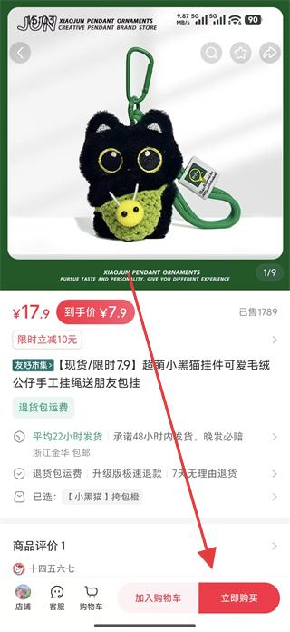 2、點擊超萌小黑貓掛件商品,進入詳情頁,查看商品圖片、價格、發貨及退貨政策,點擊立即購買,進入訂單確認頁面。